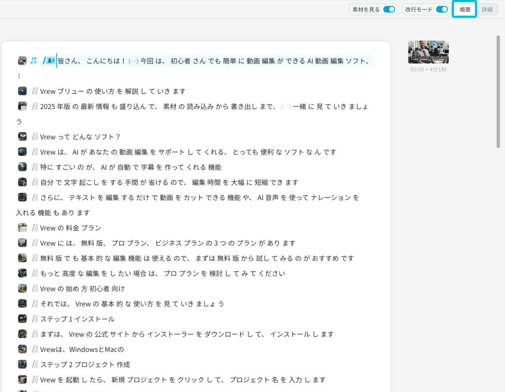 Vrewの編集画面そのものが“台本兼構成表”になれる見やすさがあります。